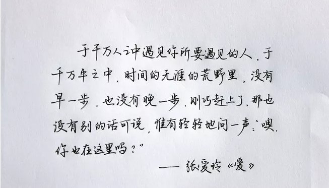 原文中有这么一段:于千万人之中遇见你所遇见的人,于千万年之中,时间的无涯的荒野里,没有早一步,也没有晚一步,刚巧赶上了,那也没有别的话可说,惟有轻轻地问一声:“噢,你也在这里吗?”